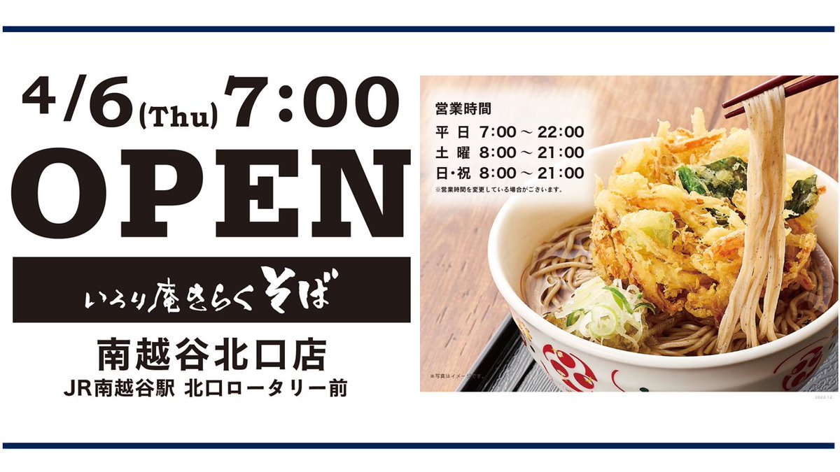 - 2023年4月6日、南越谷に【いろり庵きらくそば 南越谷北口店】がオープン。